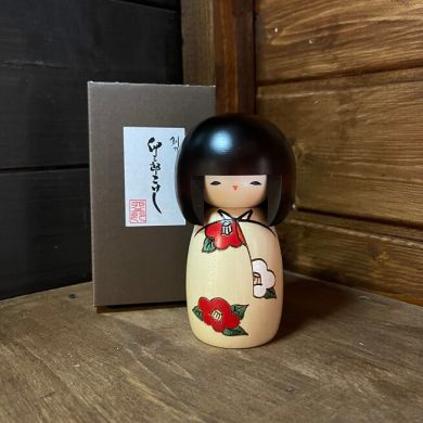 Questa bambola kokeshi interamente in legno realizzata dagli artisti della Usaburo Kokeshi è chiamata Zokan Momiji per l’incisione delle foglie di acero (momiji) sul kimono nero. La bambola è corredata da scatola originale e targa con il nome dell’autore giapponese che l’ha creata.